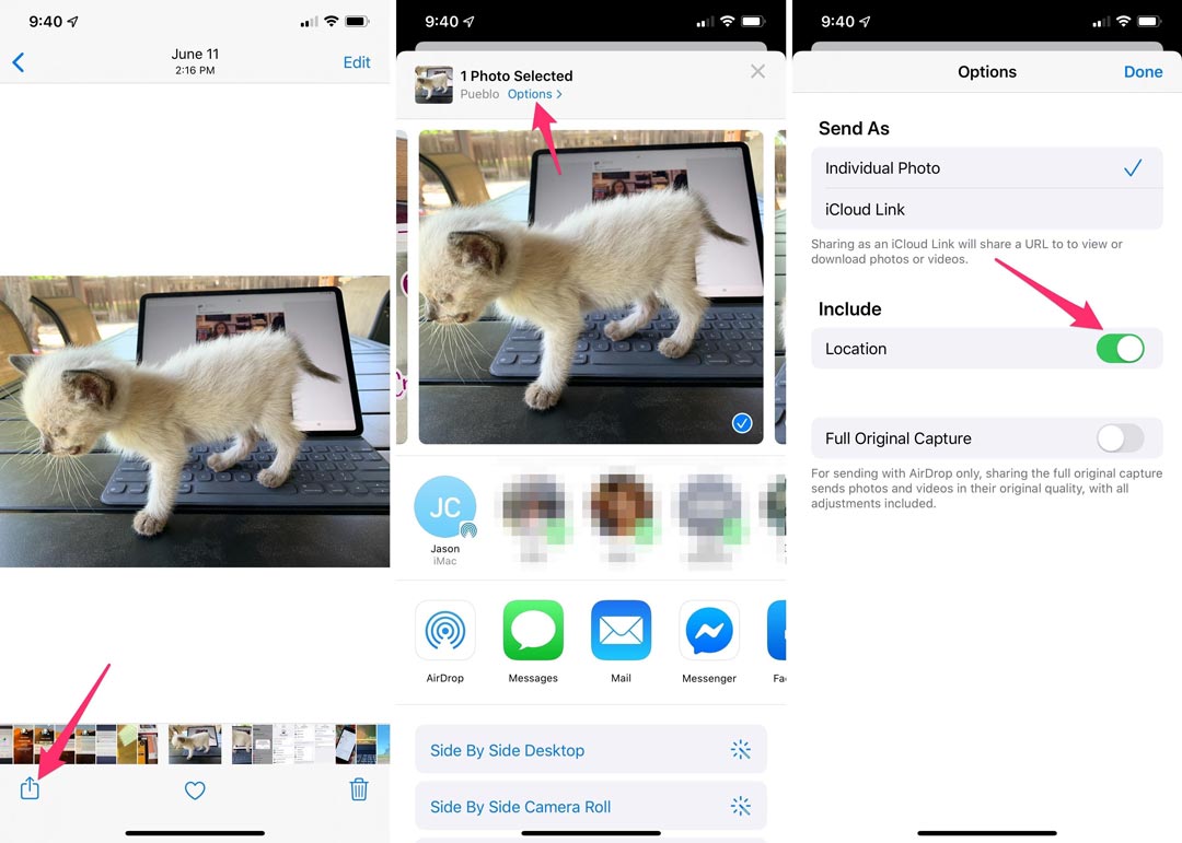 یک عکس (یا هر عکسی) که می خواهید اشتراک گذاری کنید را در برنامه Photos خود انتخاب کنید، سپس روی گزینه ها در بالای صفحه ضربه بزنید و موقعیت مکانی را که تحت عنوان Include وجود دارد را خاموش کنید.